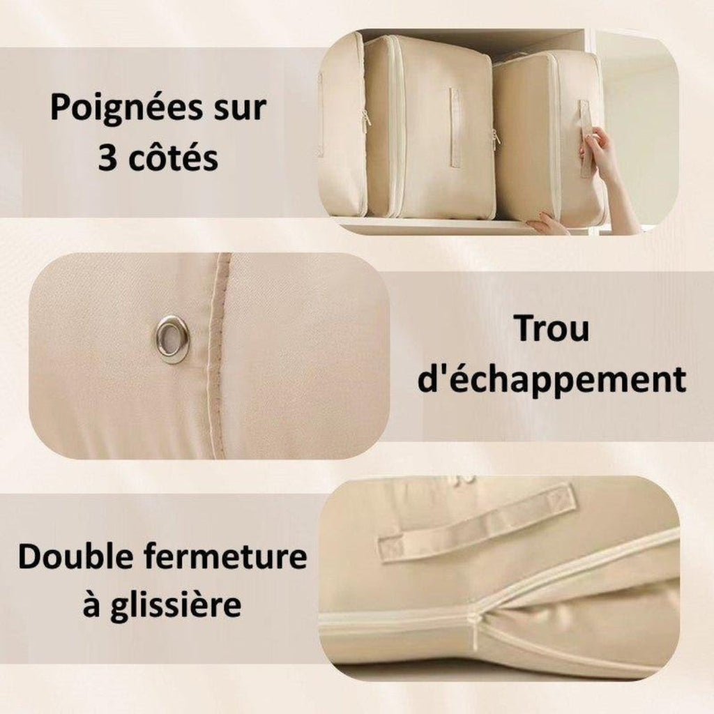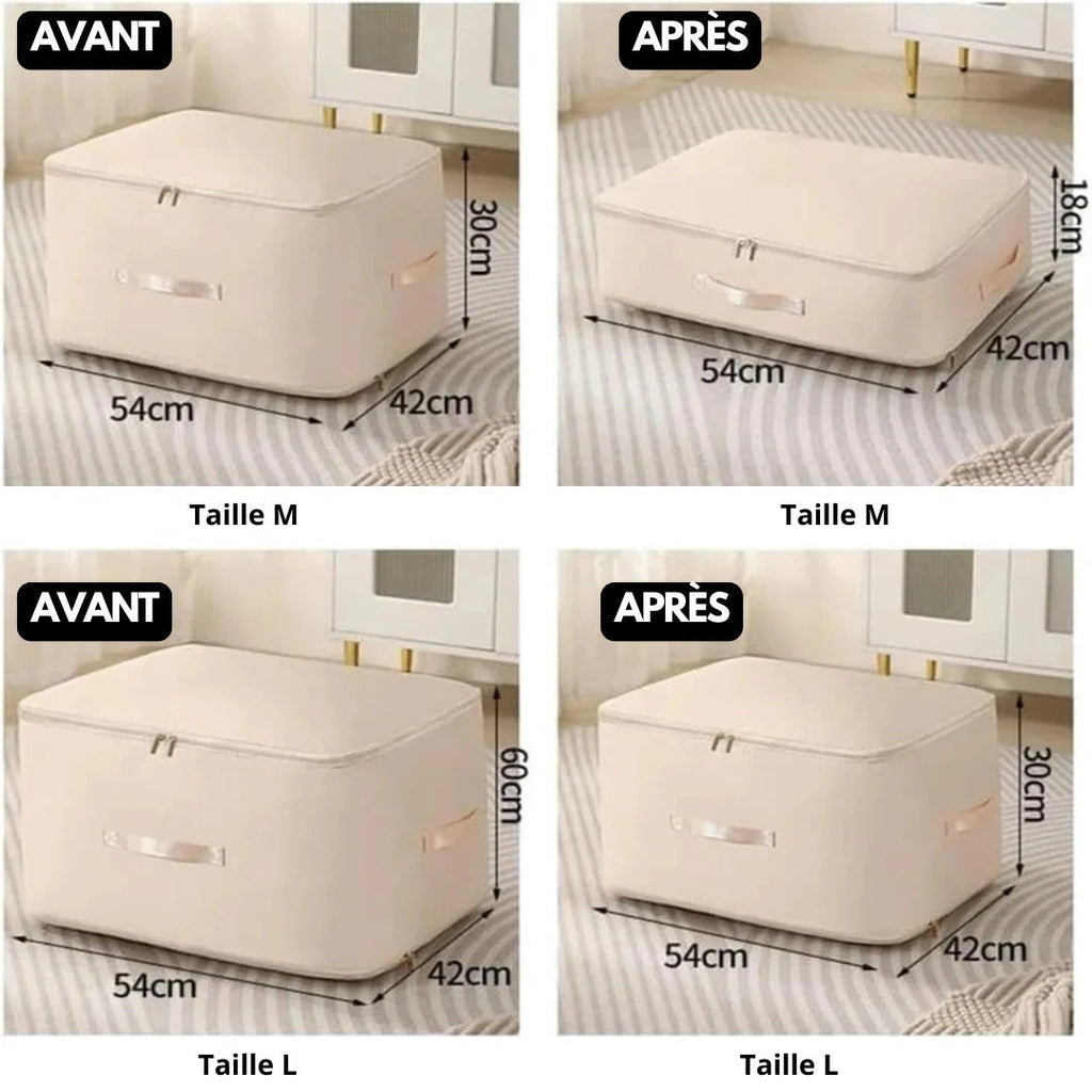 Instantly optimize your space with this ultra-practical compressible bag, designed to reduce the volume of your clothes, duvets, or towels by up to 75%. Thanks to its manual compression system, no vacuum cleaner or pump is needed: simply zip it closed, roll or press down, and the air is naturally expelled. Ideal for small spaces, suitcases, seasonal changes, or compact living spaces, it also protects your belongings from moisture, dust, and insects. Made from a waterproof and breathable fabric, reusable and machine washable, this bag combines efficiency, practicality, and durability. A must-have for an organized home, light travel, or smart space saving every day.