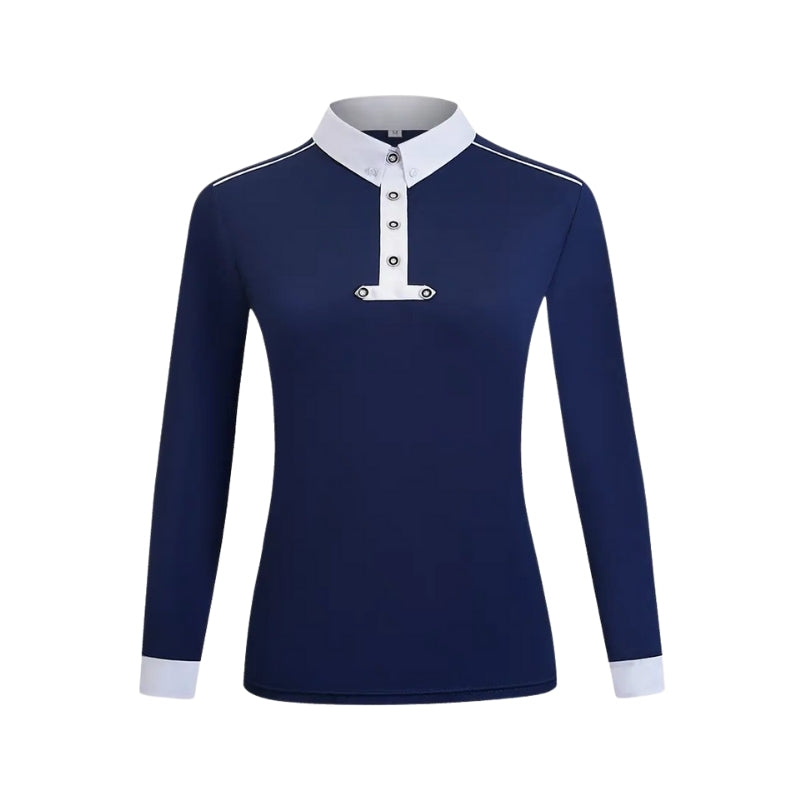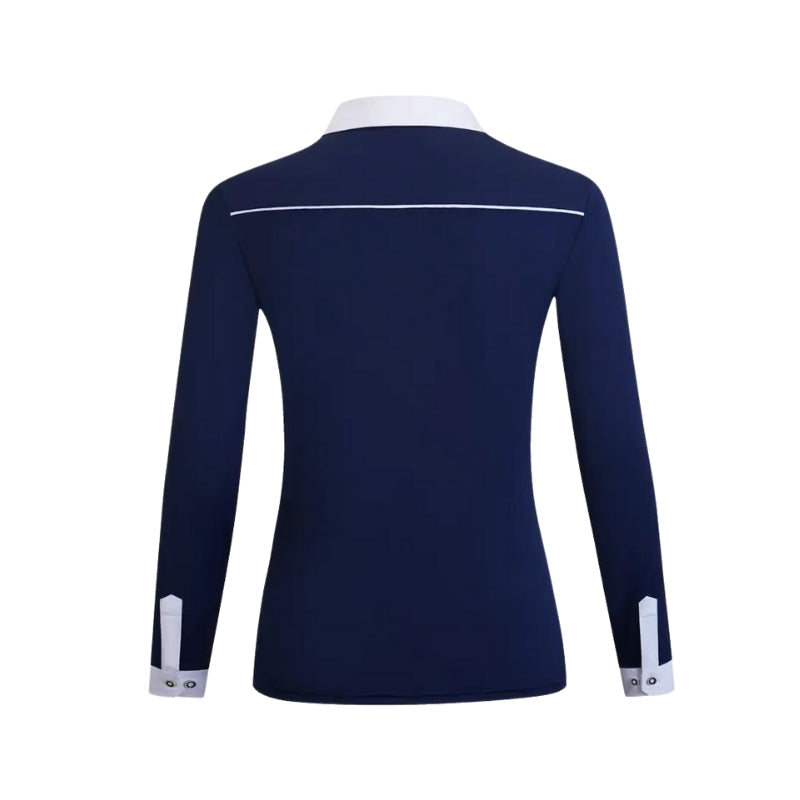 Cette blouse au design intemporel apporte une touche de sophistication à votre tenue tout en restant parfaitement adaptée à un usage quotidien : confectionnée dans un mélange léger et extensible de polyester et d’élasthanne, elle offre une excellente liberté de mouvement et une respirabilité idéale pour les journées actives ou les séances d’équitation, tandis que ses finitions soignées – col blanc classique, poignets réglables avec boutons et contrastes élégants – en font une pièce polyvalente que vous pouvez porter seule ou associée à une veste, aussi bien en compétition que lors de sorties plus décontractées.