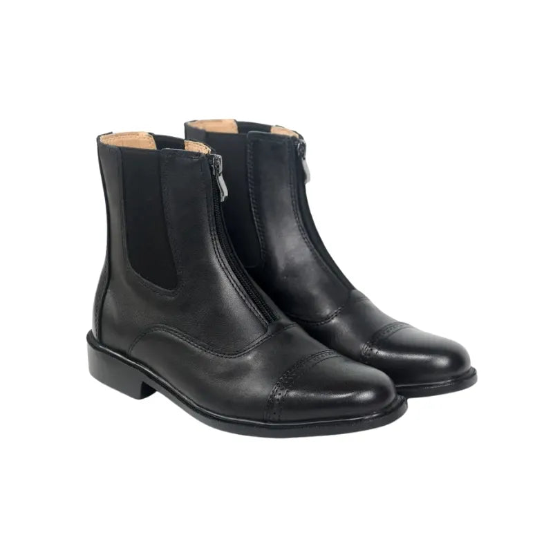 Ces bottines d’équitation en cuir noir vous offrent un style classique et raffiné tout en assurant un confort durable : leur conception ergonomique avec doublure intérieure douce garantit un ajustement parfait pour vos longues séances, tandis que le cuir véritable, la semelle antidérapante et le zip frontal robuste vous apportent à la fois sécurité, praticité et performance, que ce soit à l’entraînement, en dressage ou en compétition.