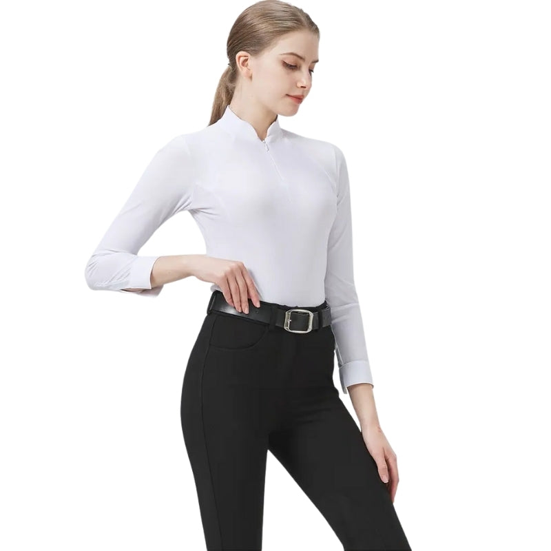 La chemise équestre Élégance Blanche est un classique intemporel pensé pour sublimer votre tenue en selle tout en vous offrant un confort irréprochable : confectionnée dans un mélange léger de polyester et d’élasthanne, elle est respirante, extensible et accompagne chacun de vos mouvements, que ce soit à l’entraînement, en concours ou lors de sorties plus décontractées ; son col montant avec fermeture éclair discrète apporte une touche chic et professionnelle, tandis que sa coupe ajustée met la silhouette en valeur sans vous gêner, et son entretien facile en machine vous permet de conserver un blanc immaculé et une allure soignée jour après jour.