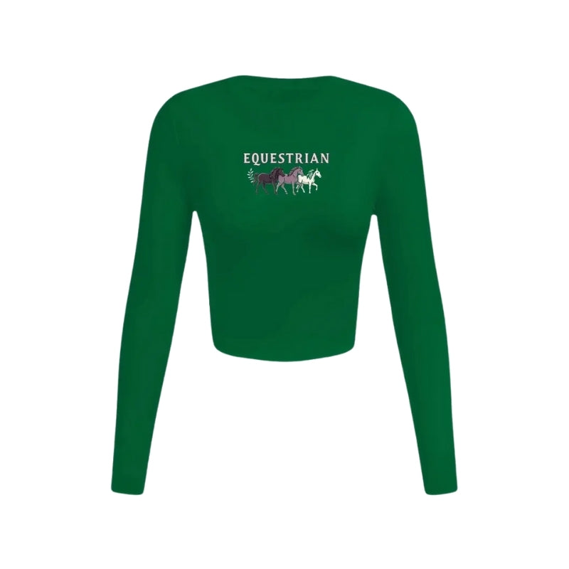 Ce haut d'équitation vert émeraude incarne un style élégant et affirmé pour toutes les passionnées d’équitation, avec son imprimé raffiné de silhouettes de chevaux et le texte "Equestrian" qui souligne la passion pour l’univers équestre; confectionné dans un mélange doux et extensible, il offre un confort optimal et accompagne les mouvements tout au long de la journée, tandis que ses manches longues apportent chaleur et protection lors des journées plus fraîches à l’écurie ou en balade; sa coupe ajustée et légèrement raccourcie met en valeur la silhouette tout en restant pratique et fonctionnelle, et sa teinte verte vive apporte une touche de fraîcheur, ce qui en fait une pièce polyvalente, idéale aussi bien pour monter à cheval que pour composer une tenue décontractée au quotidien, avec un entretien facile grâce à sa matière résistante aux lavages répétés.