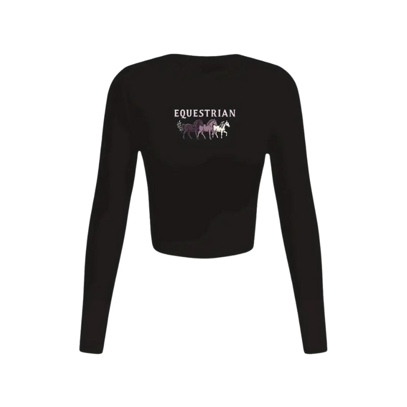 Ce haut d’équitation combine style moderne et confort pour les passionnés de chevaux : conçu dans un mélange doux et respirant de coton et polyester, il offre une coupe cintrée et courte qui met en valeur la silhouette tout en laissant une grande liberté de mouvement, ses manches longues apportent une protection supplémentaire lors des entraînements ou des compétitions, tandis que son motif équestre avec illustrations de chevaux et inscription « Equestrian » apporte une touche sophistiquée et polyvalente que vous pouvez porter aussi bien à l’écurie qu’au quotidien, avec un entretien facile en machine à 30 °C.