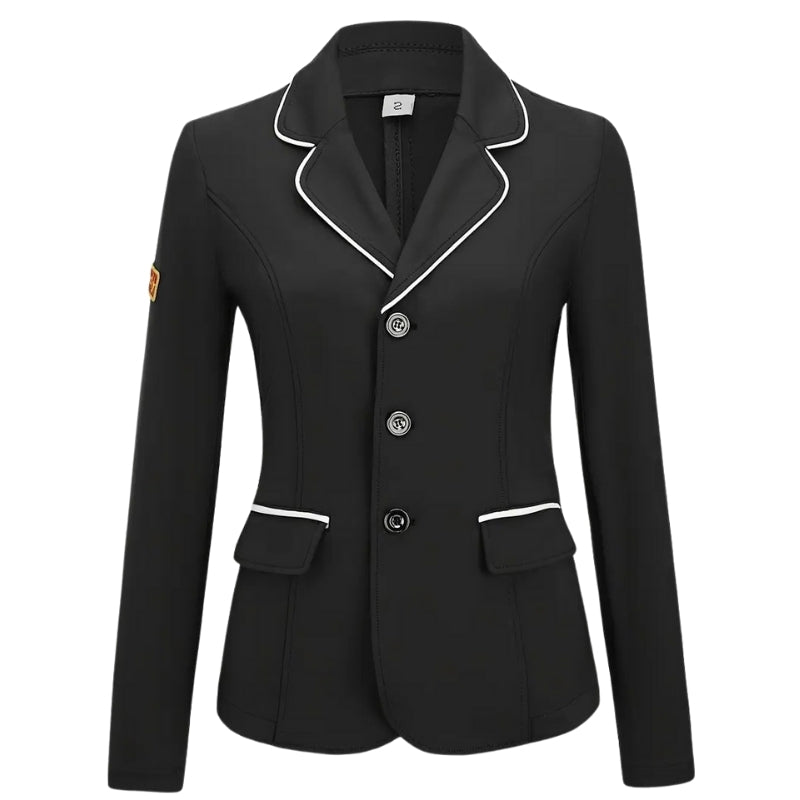 La veste équestre Élégance Noire incarne l’alliance parfaite entre style et performances, avec sa coupe ajustée en tissu extensible et respirant qui accompagne chaque mouvement pour un confort optimal en entraînement comme en compétition ; son design noir sophistiqué, rehaussé de bordures blanches et d’un col contrasté, est complété par une fermeture à trois boutons frontaux et deux poches à rabat pratiques, tandis que sa matière résistante et facile d’entretien conserve sa forme et sa couleur sortie après sortie, faisant de cette veste un incontournable pour une allure professionnelle et chic en toutes circonstances.